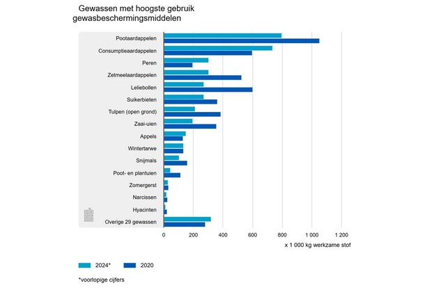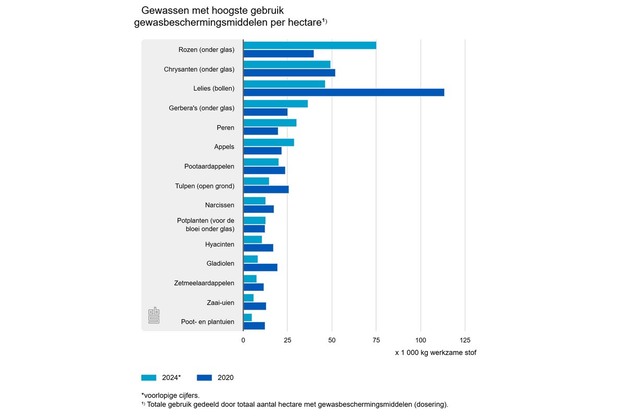 In 2024 gebruikte de landbouw, net als in 2020, meer dan de helft van de gewasbeschermingsmiddelen in de teelt van aardappelen en lelies. Voor de lelieteelt gebruiken bollentelers 273 duizend kilogram middelen, in 2020 was dat 601 duizend kilogram. Lelietelers gebruiken 220 duizend kilogram minder paraffineolie. Het schimmelbestrijdingsmiddel mancozeb is inmiddels verboden; in 2020 gebruikte de lelieteelt daar nog 114 duizend kilogram van. Daardoor is het middelengebruik voor schimmelbestrijding voor lelies 72 procent lager dan in 2020.