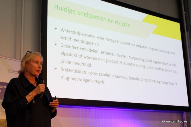 De voorzitter van Glastuinbouw Nederland vertelde dat er 'een aantal aanvragen lopen' op het gebied van waterstofperoxide, waarvan de verwachting is dat ze beter aansluiten bij de glastuinbouwpraktijk. Bekend is dat het actief meedruppelen van waterstofperoxide nadrukkelijk een wens uit de glastuinbouwpraktijk is. "We moeten roeien met de riemen die er zijn, maar die riemen moeten wel werkbaar zijn", sloot Bom-Lemstra haar bijdrage over biociden af.
