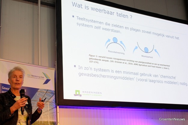 Caroline van der Salm van de WUR gaf daarna haar visie op weerbaar telen. Dat deed ze in relatie tot Kennis in je Kas, waarover Margreet Schoenmakers namens Glastuinbouw Nederland meer vertelde. Margreet had ook een primeurtje: ze mocht de nieuwe website 'Het Nieuwe Doen in Plantgezondheid' presenteren.