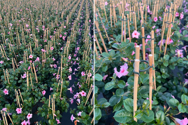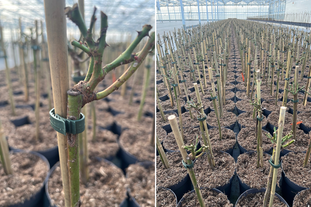 Voor de stamrozen gebruikt Bright Plants inmiddels de rozenclips van Amevo om de stam stevig aan de stok te bevestigen. Bij de mandevilla worden driestokklemmen toegepast, een nieuw ontwerp dat in samenwerking met Amevo tot stand kwam. "Met het nieuwe ontwerp blijven de stokken veel beter vastzitten dan voorheen," zegt Donny van der Burg van Bright Plants. "Dat is precies het voordeel van direct contact: je kunt samen ontwerpen en krijgt materialen die echt aansluiten op je teelt."