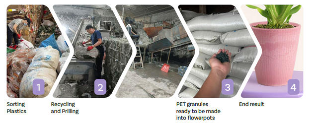 In China wordt plastic uit rivieren gerecycled tot hoogwaardig PPS, dat samen met natuursteenpoeder wordt verwerkt tot Polystone. Van dit duurzame materiaal worden stijlvolle bloempotten gemaakt, een perfecte mix van design en milieubewustzijn.