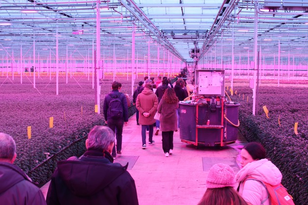 De groep wilde vooral weten hoe er binnen de chrysantenteelt wordt gewerkt aan duurzaamheid, wat de grootste teeltuitdagingen zijn en wat het verschil is tussen telen onder LED in vergelijking met Son-T. Ook de verkoopstrategie kwam aan bod, net als de vraag welke eigenschappen een bloem onmisbaar maken voor de afzet.