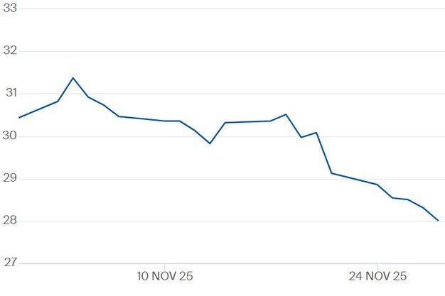 TTF-gasprijs voor het contract Cal 2026 t/m 28 november 2025. Klik hier voor de actuele gascontractprijzen.