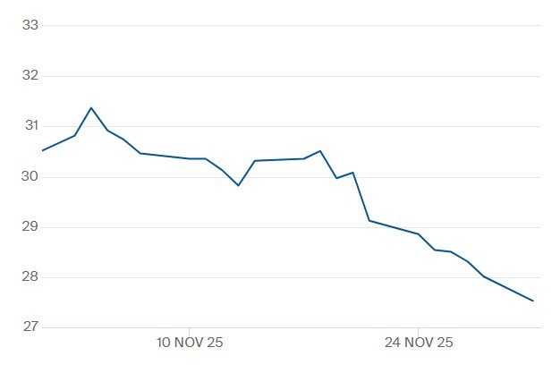 TTF-gasprijs voor het contract Cal 2026 t/m 1 december 2025. Klik hier voor de actuele gascontractprijzen.