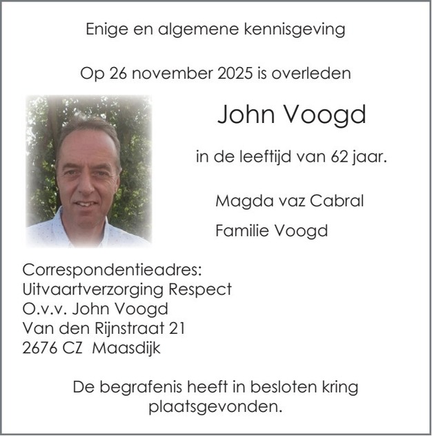Op 26 november 2025 is John Voogd overleden. Dat melden Magda vaz Cabral en de familie Voogd als 'enige en algemene kennisgeving' in het Nieuwsblad Westland.