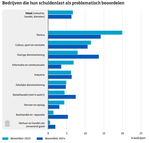 In de horecasector worstelt een op de vijf bedrijven met problematische schulden, tegen 14 procent in 2024. Ook in de sector informatie en communicatie is het aandeel bedrijven met een problematische schuldenlast gestegen, van 3,6 naar 6,9 procent. In andere sectoren zoals detailhandel, autohandel en overige dienstverlening is het aandeel juist gedaald. De laagste schuldenlast wordt gemeld in de verhuur en handel van onroerend goed (0,6 procent).
