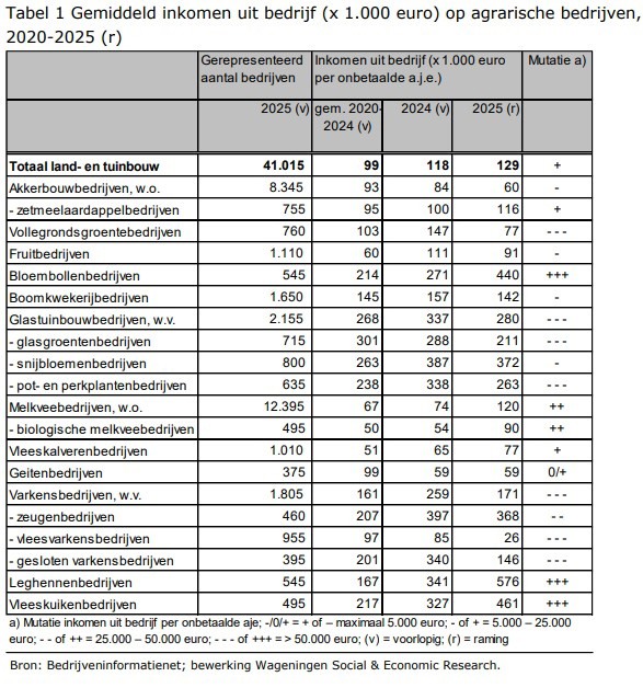 Het geraamde inkomen in 2025 is € 30.000 hoger dan het gemiddelde voor 2020-2024 voor de hele Nederlandse land- en tuinbouw. De verschillen in bedrijfsinkomens zijn zoals altijd groot: 20% van de bedrijven heeft een inkomen van minder dan € 3.000, terwijl ook 20% meer dan € 177.000 per onbetaalde aje verdient.