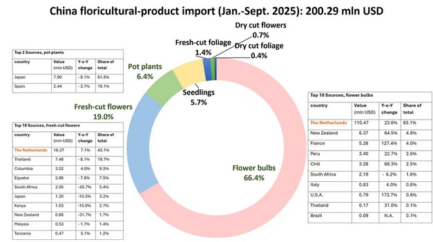 China importeerde in de eerste negen maanden van 2025 voor ruim 200 miljoen dollar (circa 170,4 miljoen euro) aan sierteeltproducten, een stijging van 12,4% ten opzichte van dezelfde periode een jaar eerder. Ongeveer twee derde van deze import bestaat uit bloembollen, een segment waarin Nederland veruit de grootste leverancier is.
