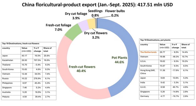 China exporteerde in dezelfde periode voor 417,5 miljoen dollar (355,7 miljoen euro) aan sierteeltproducten, een groei van 12,7% op jaarbasis. Snijbloemen zijn de belangrijkste groeimotor: de export steeg met 47,1% en vertegenwoordigt inmiddels 40% van de totale uitvoer.