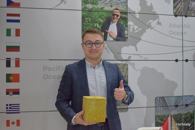 Kyrylo Gliuza met een gerberablok tijdens GrowTech Antalya, Turkije