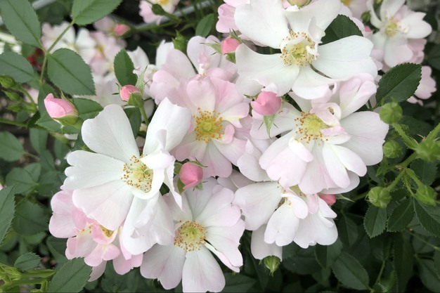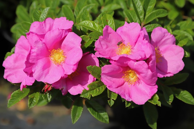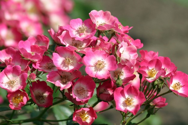 Nervia ('Vismofau'): Hoewel deze roos van Viva International is ingedeeld als bodembedekkende roos/heesterroos, varieerde de hoogte op de verschillende locaties tussen 60 tot 130 cm. De hardroze, iets gevulde bloemetjes verkleuren naar lilaroze. De opvallende gele meeldraden zorgen voor een mooi contrast en de kelkjes van de uitgebloeide bloemen blijven beeldbepalend aanwezig. Na de bloei ontstaan kleine bottels, die lang groen blijven en later oranje verkleuren.