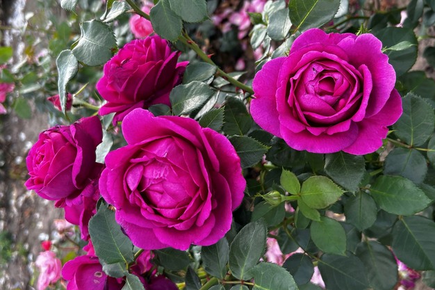 Für Elise ('Korelifur'): Smal opgaande floribundaroos van Kordes. De gevulde bloemen hebben een dieppaarse magenta kleur. De hoogte is 50 tot 110 cm met uitschieters tot 140 cm.