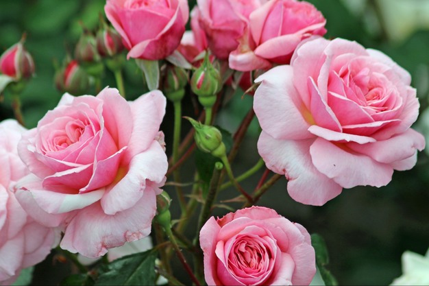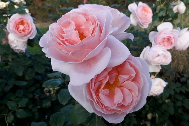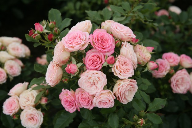 Xenia ('Korelpusch'): Breed opgaande floribundaroos van Kordes. De bloemetje hebben roze kleurtinten die naar crème verbleken. Ze verschijnen in grote trossen en zijn volledig gevuld. Na de bloei ontstaan groene bottels die later oranje kleuren. Op de locaties varieerde de hoogte van 50 tot 140 cm.
