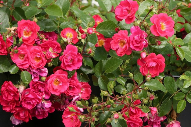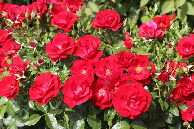 Cayenne ('Koroutofko'): Heesterroos van Kordes met halfgevulde, diep fluwelig rode bloemen. De gele meeldraden steken mooi af tegen de donkere bloemkleur. De bloemen geuren licht en schonen goed. Bereikt een hoogte van 80 tot 140 cm.