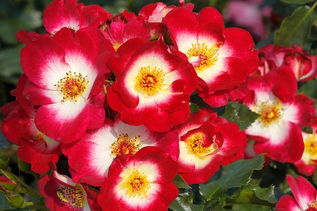 Speedway ('Boruispewi'): Compacte heesterroos van De Ruiter Innovations en Boot & Dart Boomkwekerijen. De roze enkelvoudige bloemen met geel hartje geuren licht en schonen goed. De roos is vrijwel stekelloos. In de zomer verschijnen groene bottels die later rood verkleuren. Bereikt een hoogte tussen 50 en 100 cm.