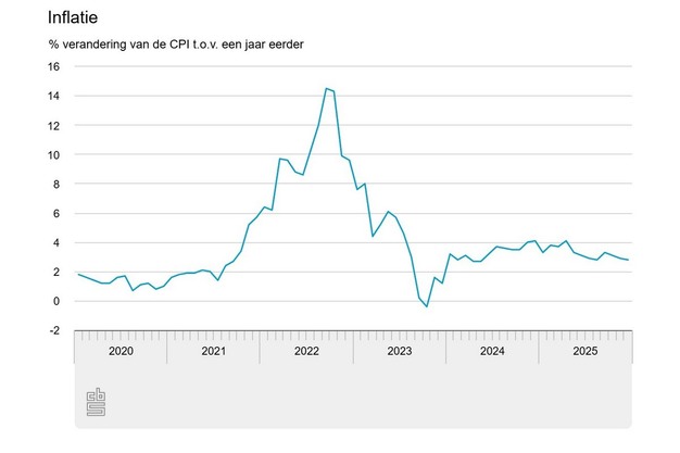 De prijzen van consumentengoederen- en diensten waren over heel 2025 gemiddeld 3,3 procent hoger dan in 2024, maakt het Centraal Bureau voor de Statistiek (CBS) bekend. In 2024 was de inflatie ook 3,3 procent. De inflatie wordt gemeten als de ontwikkeling van de consumentenprijsindex (CPI) ten opzichte van het voorgaande jaar. De prijsontwikkelingen van huisvesting, voedingsmiddelen en alcoholvrije dranken hadden de grootste bijdrage aan de inflatie in 2025.