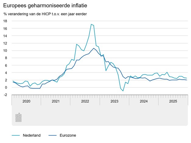 Het CBS publiceert twee verschillende cijfers voor inflatie. Een op basis van de consumentenprijsindex (CPI) en een op basis van de Europees geharmoniseerde consumentenprijsindex (HICP). Consumentengoederen en -diensten in Nederland zijn volgens de HICP in 2025 gemiddeld 3,0 procent duurder geworden. In 2024 was de inflatie volgens de HICP 3,2 procent. De inflatie in de eurozone daalde volgens voorlopige cijfers van 2,4 procent in 2024 naar 2,1 procent in 2025.