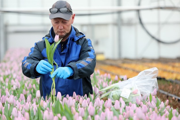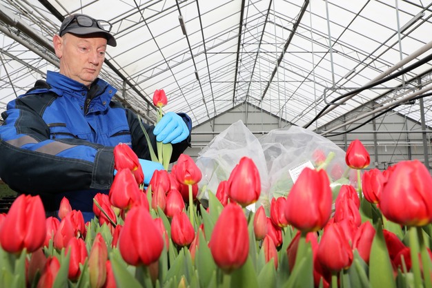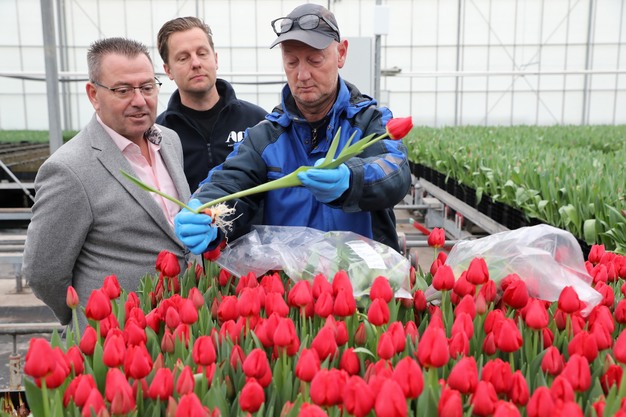 Met belangstelling kijken Paul Schouten van kwekerij A&P Flowers uit Andijk en Arjan Smit, voorzitter van Tulpen Promotie Nederland (TPN) en collega-tulpenkweker uit Spierdijk, toe hoe een onderzoeker van Eurofins residumonsters van tulpen neemt. Eurofins is een onafhankelijk, gecertificeerd bureau dat milieuanalyses uitvoert. De metingen maken deel uit van een controle op de aanwezigheid van resten van gewasbeschermingsmiddelen op de bloemen.
