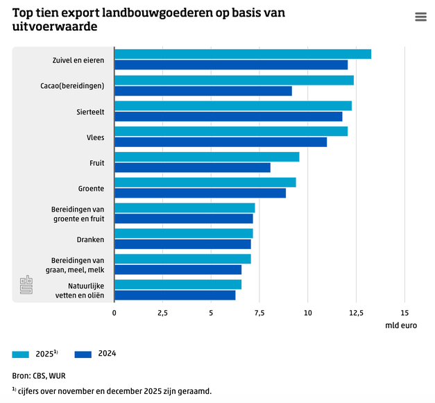 In 2025 heeft Nederland voor 137,5 miljard euro aan landbouwgoederen uitgevoerd. Dat is 8,4 procent meer dan het jaar ervoor. Dat melden Wageningen Social & Economic Research (WUR) en het Centraal Bureau voor de Statistiek (CBS) op basis van gezamenlijk onderzoek in opdracht van het ministerie van Landbouw, Visserij, Voedselzekerheid en Natuur (LVVN).