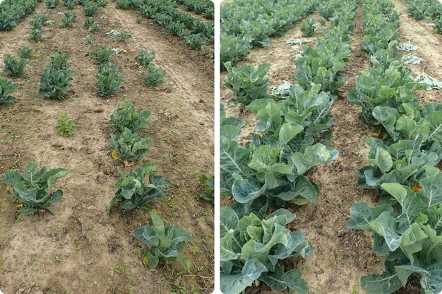Links de onbehandelde controle, rechts een proefplot waar pellets van zwarte soldatenvlieg frass zijn toegediend in de plantrij