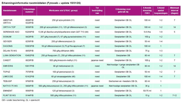 Onderstaande tabel geeft een overzicht van de erkende roestmiddelen in de sierteelt.