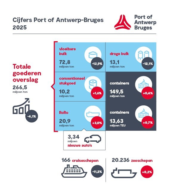 Geopolitieke spanningen, economische onzekerheid en sociale acties drukten in 2025 op de activiteiten van Port of Antwerp-Bruges. De totale overslag daalde, maar blijft globaal in lijn met de voorgaande jaren. De containertrafiek bleef stabiel, wat de rol van de haven als logistiek knooppunt bevestigt én de noodzaak van extra capaciteit benadrukt. Ook in 2026 blijft Port of Antwerp-Bruges inzetten op infrastructuur, transitie en veiligheid als fundamenten voor duurzame groei op lange termijn.