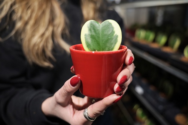 Een vaste waarde in het assortiment is de hartvormige Hoya kerrii, die rond Valentijnsdag én Moederdag terugkomt. "Die Hoya blijft het meest populair," zegt Wendy. "Maar we dachten: waarom doen we er geen leuk rood hartjespotje omheen? Dat idee hebben we doorgetrokken naar andere roze- en paarsachtige planten."