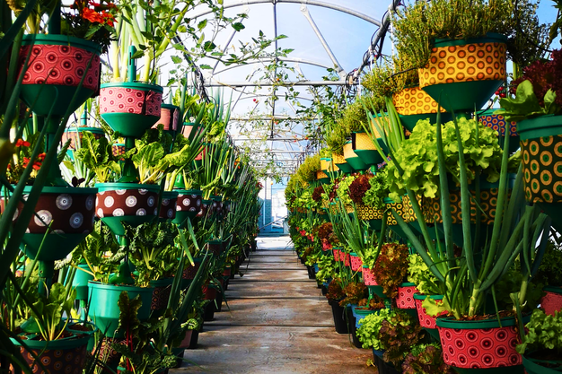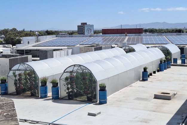 Op het dak van het Kenilworth Centre in Kaapstad, Zuid-Afrika, staan de vijf tunnels van HandPicked City Farm bloot aan wind, hitte en grote seizoensschommelingen. Twee tunnels zijn twintig meter lang, drie andere slechts zes meter, en samen herbergen ze ongeveer 340 torens wanneer ze volledig zijn beplant.