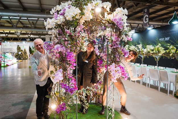 Charles Lansdorp en dochter Giulia met Dini Holtrop verzorgen de stand met Wedding Flowers waar verschillende veredelaars en kwekers bloemen laten zien, specifiek voor bruiloften