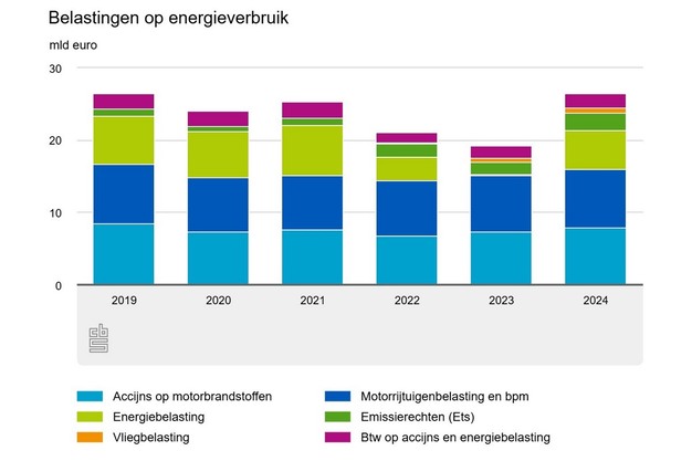 Van alle belastingen op het energieverbruik had 60 procent in 2024 te maken met wegvervoer: accijns op motorbrandstoffen, belasting op de aanschaf van een auto of motor (bpm) en motorrijtuigenbelasting. Wanneer de btw geheven op accijnzen wordt meegeteld dan is dit aandeel zelfs 63 procent. 20 procent kwam uit de energiebelasting op elektriciteit in aardgas.