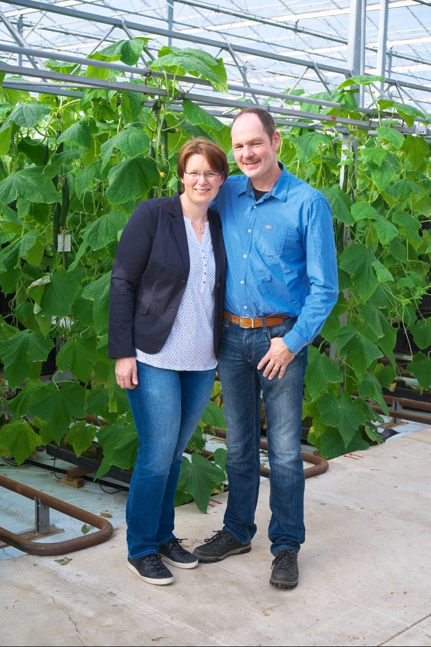 Foto: Maarten met zijn vrouw in de komkommerkas.