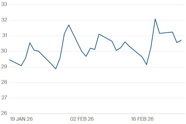 TTF-gasprijs voor het contract Q1 2027 t/m 25 februari 2026. Klik hier voor de actuele gascontractprijzen.