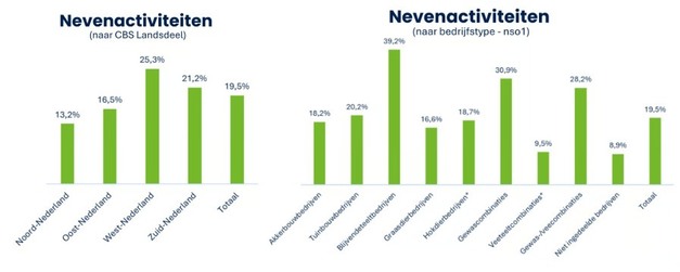 Uit de database van AgriDirect blijkt dat ongeveer 1 op de 5 agrarische bedrijven één of meer nevenactiviteiten heeft. Deze activiteiten lopen sterk uiteen. De data laat zien dat de nevenactiviteiten vooral bestaan uit verkoop van producten aan huis, zorgactiviteiten, educatieve activiteiten, recreatieve activiteiten zoals rondleidingen of workshops of het aanbieden van overnachtingsmogelijkheden.