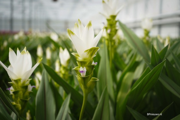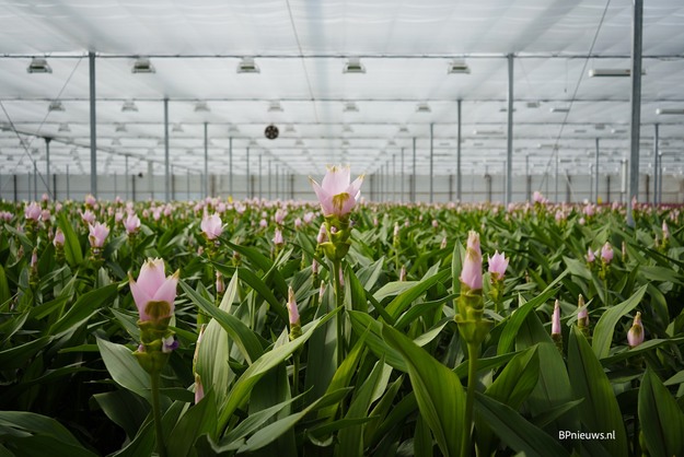 Tholen - Het is een zonnige dag in de 'tropische' kas van Villa Curcuma aan de Broekpolderlaan in Honselersdijk. De kas staat vol met grote bloemen in roze, witte en paarse tinten en de curcuma is nu op alle veilingen verkrijgbaar, van Naaldwijk tot Aalsmeer en Rijnsburg tot Ede en Rhein-Maas.