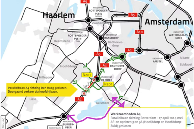Rijkswaterstaat leidt zoveel mogelijk het verkeer om via de A4 en knooppunt Badhoevedorp. De route via Kudelstaart, Leimuiden naar knooppunt Burgerveen is voor het Sierteelt verkeer een goed alternatief. De route vanaf de A4 naar hub Aalsmeer blijft via de N201 beschikbaar.