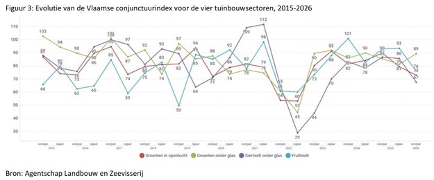 De Vlaamse landbouwconjunctuurindex daalt in het voorjaar van 2026. Deze terugval hangt vermoedelijk samen met het gedaalde vertrouwen, veroorzaakt door geopolitieke spanningen maar ook door afzetproblemen en stijgende energieprijzen. Met uitzondering van de varkenssector en de glasgroenten noteren alle landbouwdeelsectoren een daling in vertrouwen.