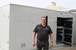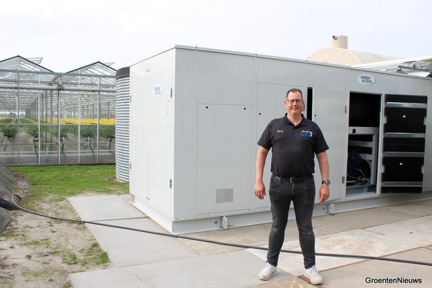 Rob Grotard bij de warmtepomp naast de kassen van Kwekerij Loos in Moerstraten.