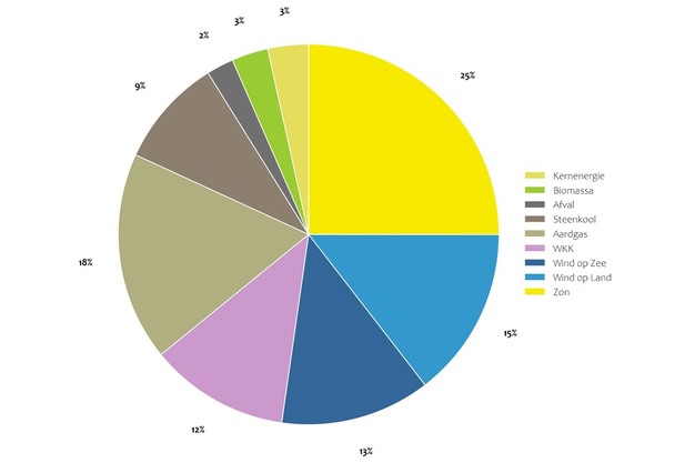 Cirkeldiagram elektriciteitsproductie per bron maart 2026, via Nationaal Energie Dashboard