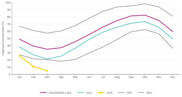 Vulgraad in % van de afgelopen 5 jaar, 2025, 2026 en de minimale en maximale vulgraden in de jaren 2021-2026, via Nationaal Energie Dashboard