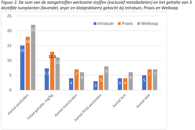 Volgens PAN-NL bevatten de onderzochte planten gemiddeld 7,3 residuen per plant. Onder de onderzochte soorten waren onder meer lavendel, vlinderstruik, klokjesbloem en rozemarijn. Van de planten bevatte 82 procent één of meerdere insecticiden, PFAS-pesticiden en zogeheten Kandidaten voor Vervanging. Daarnaast werden dertien stoffen aangemerkt als zeer gevaarlijke pesticiden.