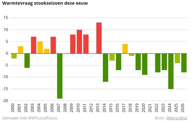 Ondanks een periode met echt winterweer in de maand januari was de warmtevraag over het hele stookseizoen aanmerkelijk lager dan gemiddeld. Dit kwam door relatief zacht weer in de maanden december, februari en maart, stelt Weeronline. Ondanks deze constatering is de gasvoorraad deze winter wel verder leeggetrokken dan voorgaande jaren, waardoor de markt rekening houdt met hogere prijzen, omdat de voorraden verder aangevuld moeten worden in uitdagende tijden.
