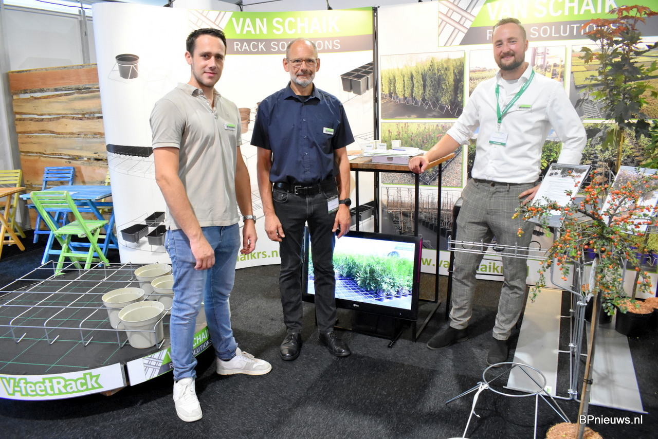 De heren van Floor van Schaik Rack Solutions stonden er natuurlijk met hun oplossingen voor het omwaaien van planten. Van links naar rechts: Gerben van Schaik, Floor van Schaik en Bennet van den Brink. Afgelopen jaar hebben de heren een stijging gezien in de verkoop doordat er meer product op de kwekerijen is blijven staan.