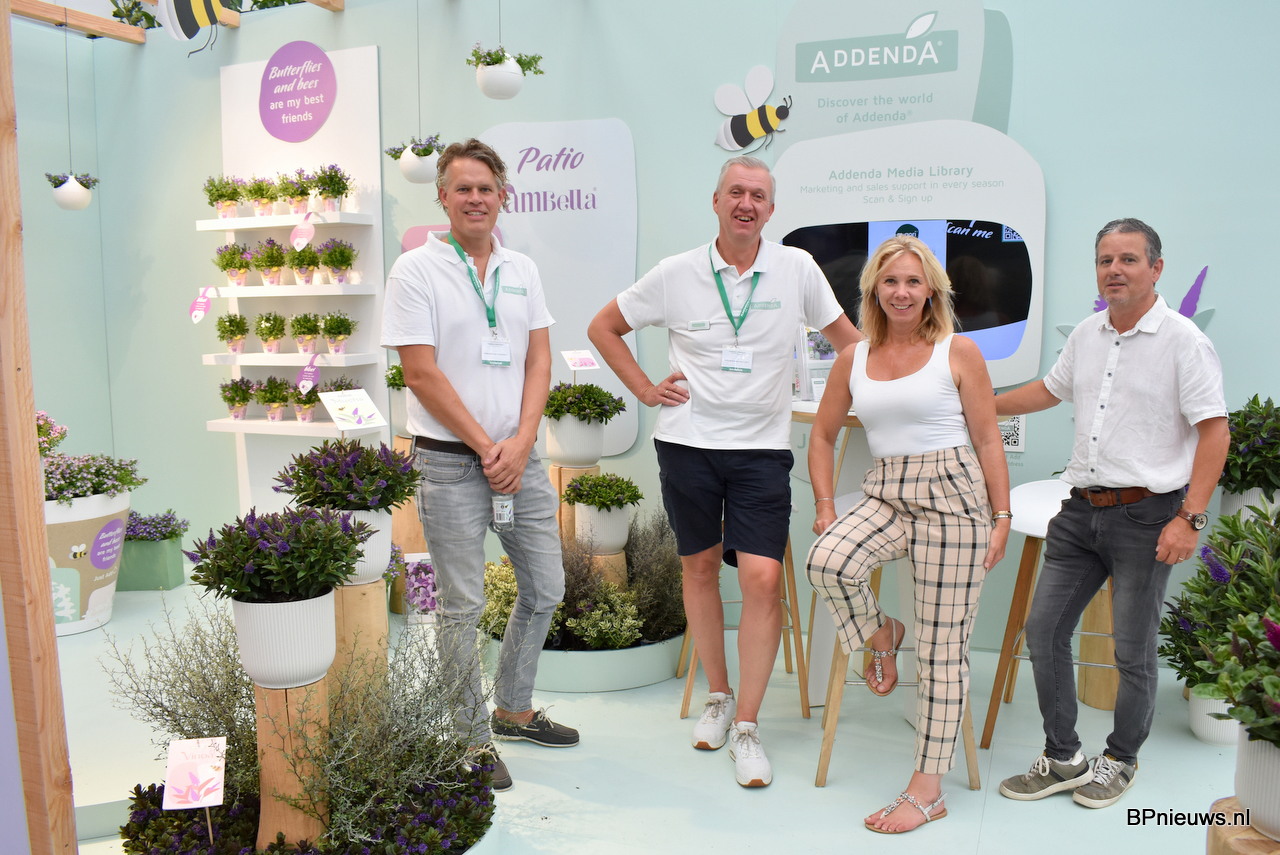 Het was een gezellige boel in de stand van Addenda. Deze Plantarium|Groen-Direkt werd er naast de producten voor dit seizoen gefocust op hun Addenda Media Library. Hiermee voorzien ze de kwekers van alle promotiematerialen die ze nodig hebben, van sfeerfotografie tot aantrekkelijke schappenplannen. Van links naar rechts: Ewoud Meeuwissen, Katarina Bresser, Peter Bresser en Jerrie van Leeuwen.