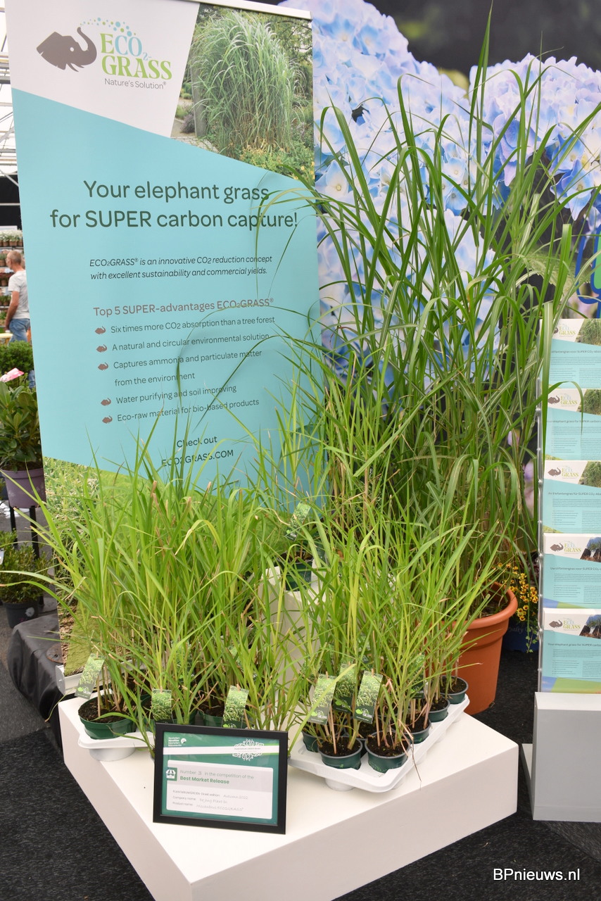Een van de noviteiten van De Jong Plant is hun Eco2Grass, oftewel Elephant Grass. Dit speciale product heeft de 3e prijs gewonnen voor Best Market Release deze Plantarium. Opmerkelijk is dat dit grass per m2 6x zoveel co2 opneemt als een bos per m2 doet.