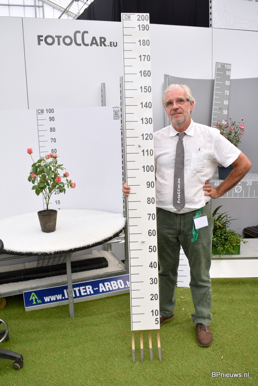 Pierre Demesmaeker van FotoCCar.eu. Pierre toonde deze beurs naast zijn mobiele fotokarren nu een nieuwe slimme oplossing, een handige maatlat voor de vollegrond teelt. Overal in de grond te steken en verstelbaar. Degene die hij toonde was gelijk al verkocht.