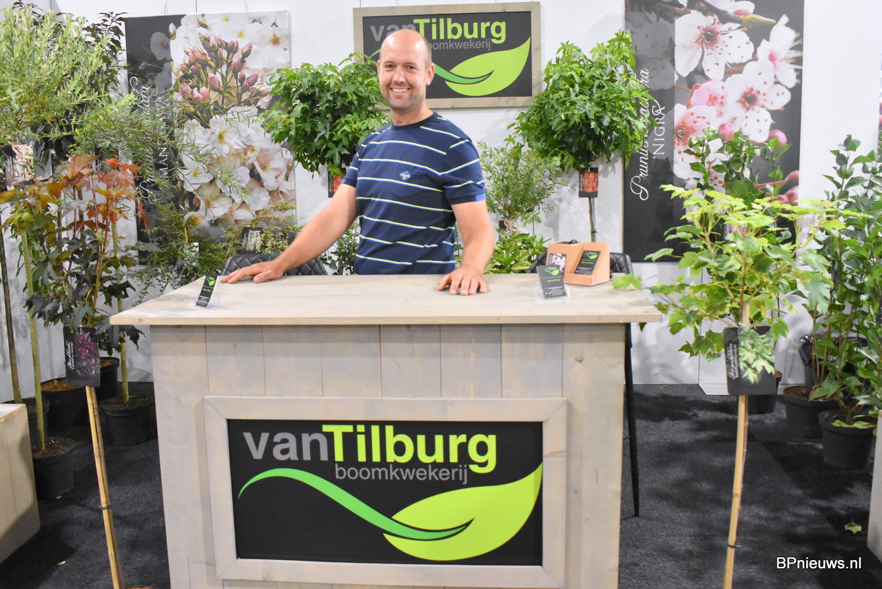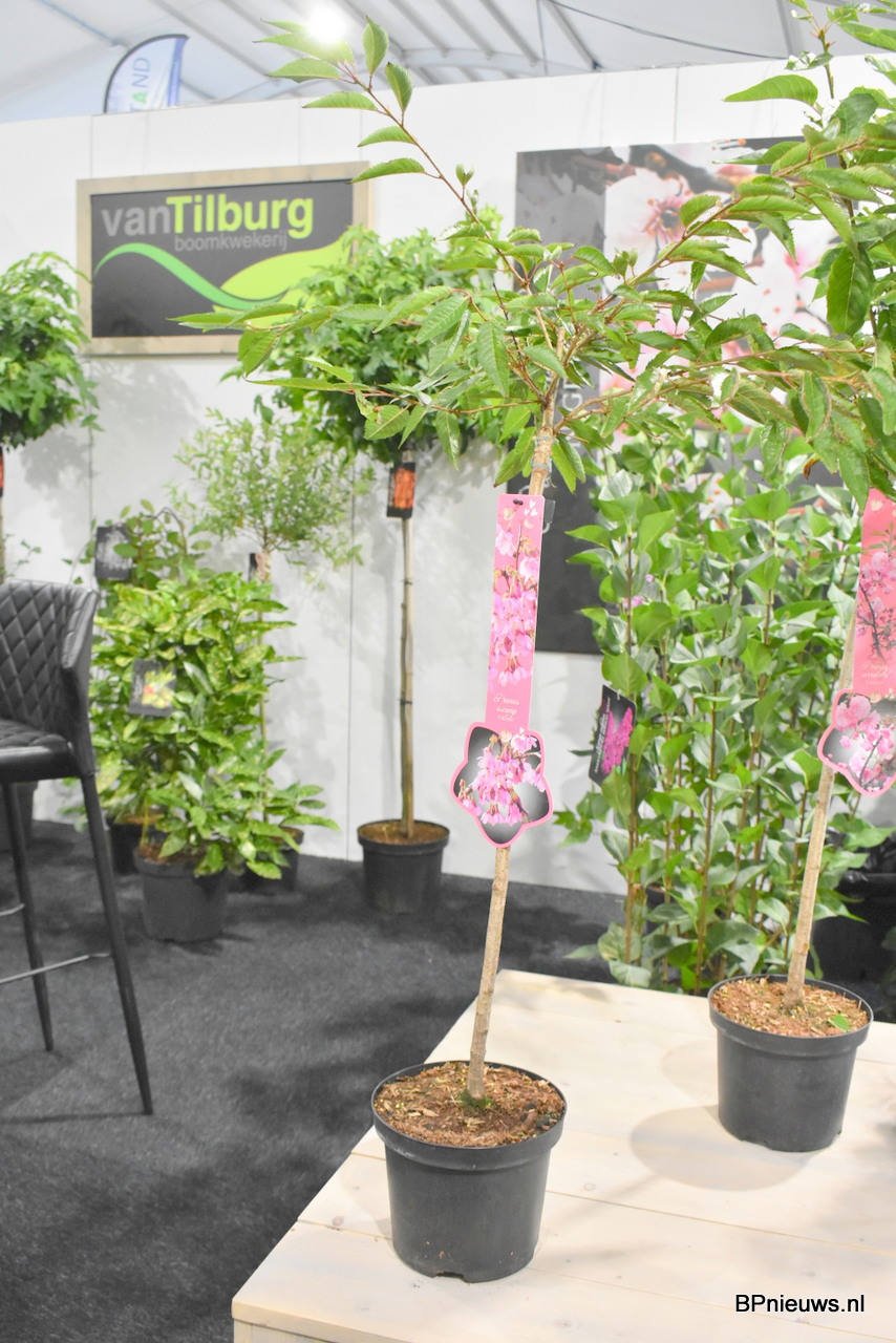 Niels van Tilburg stond op de beurs met zijn sierheesters op stam en grote solidaire struiken in pot. Hij gaf deze beurs extra aandacht aan zijn bloeiende Prunussen.