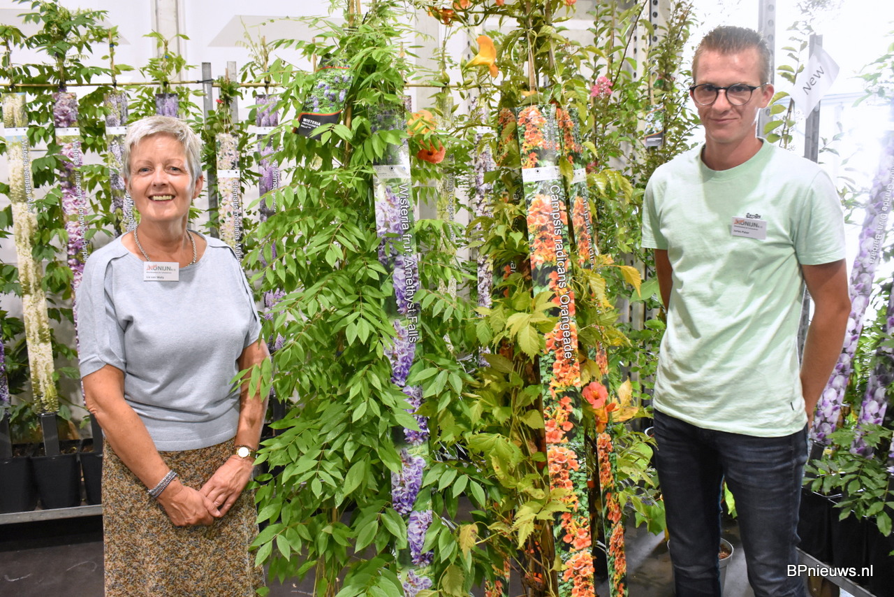 Lia van Wely en Jories Pater stonden namens Leen Konijn Boomkwekerij & Tuincentra op de beurs. Lia staat bij hun Wisteria Amethyst, één van hun gepatenteerde soorten. Jories is altijd aan het werk in de boomkwekerij en staat naast hun Campsis Radicans 'Orangeade'