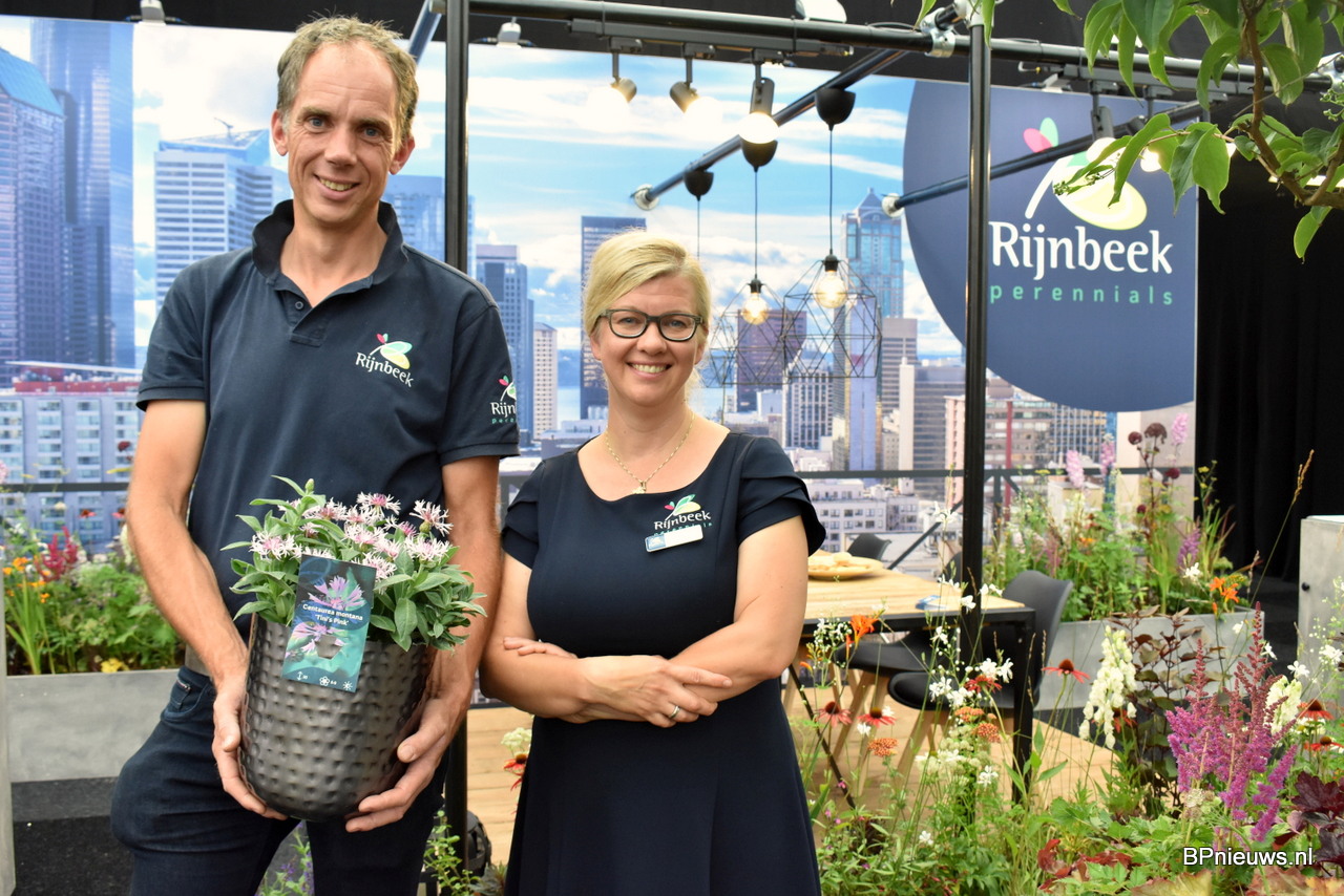 Arno en Olga Rijnbeek met hun Centaurea Montano 'Tini's Pink'. Het is een soort hun eigen selectie en springt eruit door zijn kleurstelling en droogte resistentie. Dit soort heeft ook zilver gewonnen op de beurs dit jaar bij de KVBC keuring.