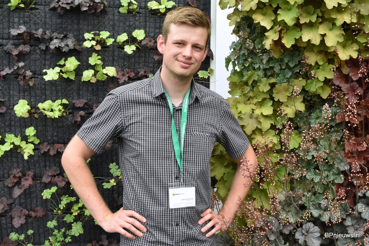 Lukas Evercooren van Denis Plants bij hun nieuwe Greentecstyle concept. Met dit concept wilt Denis Plants, samen met partners, meer groen in de stad brengen door middel van deze verticale tuinen.