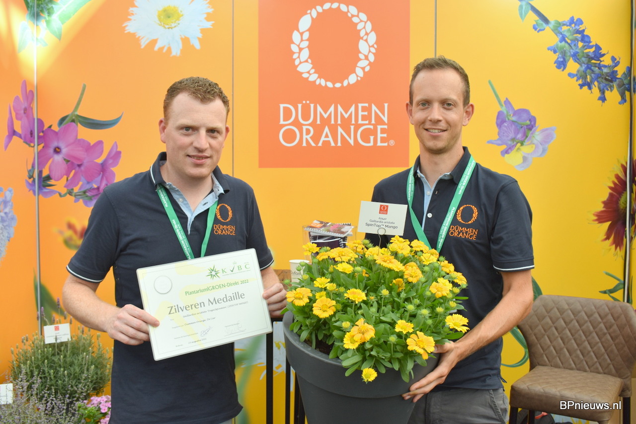 Robbin den Herder en Jasper van den Berg met de, dit jaar geïntroduceerde, Gaillardia Aristata Spin Top Mango. Het soort het tevens zilver gewonnen voor beste nieuwigheid en wordt gekenmerkt door de compactheid en vele vertakkingen waardoor hij lekker stevig in de pot staat. Daarbij is het een nieuwe kleur in het SpinTop assortiment van Dummen Orange.